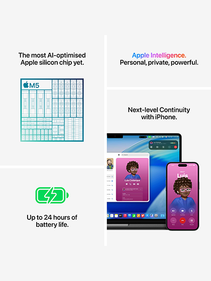 The M5 chip is built from the ground up for on-device AI and delivers next-generation speed to 35.97 cm (14″) models.◊Refer to legal disclaimers. M4 Pro and M4 Max deliver powerful AI capabilities and even higher performance. And with a stunning Liquid Retina XDR display and up to 24 hours of battery life, you can Pro all day.◊Refer to legal disclaimers.